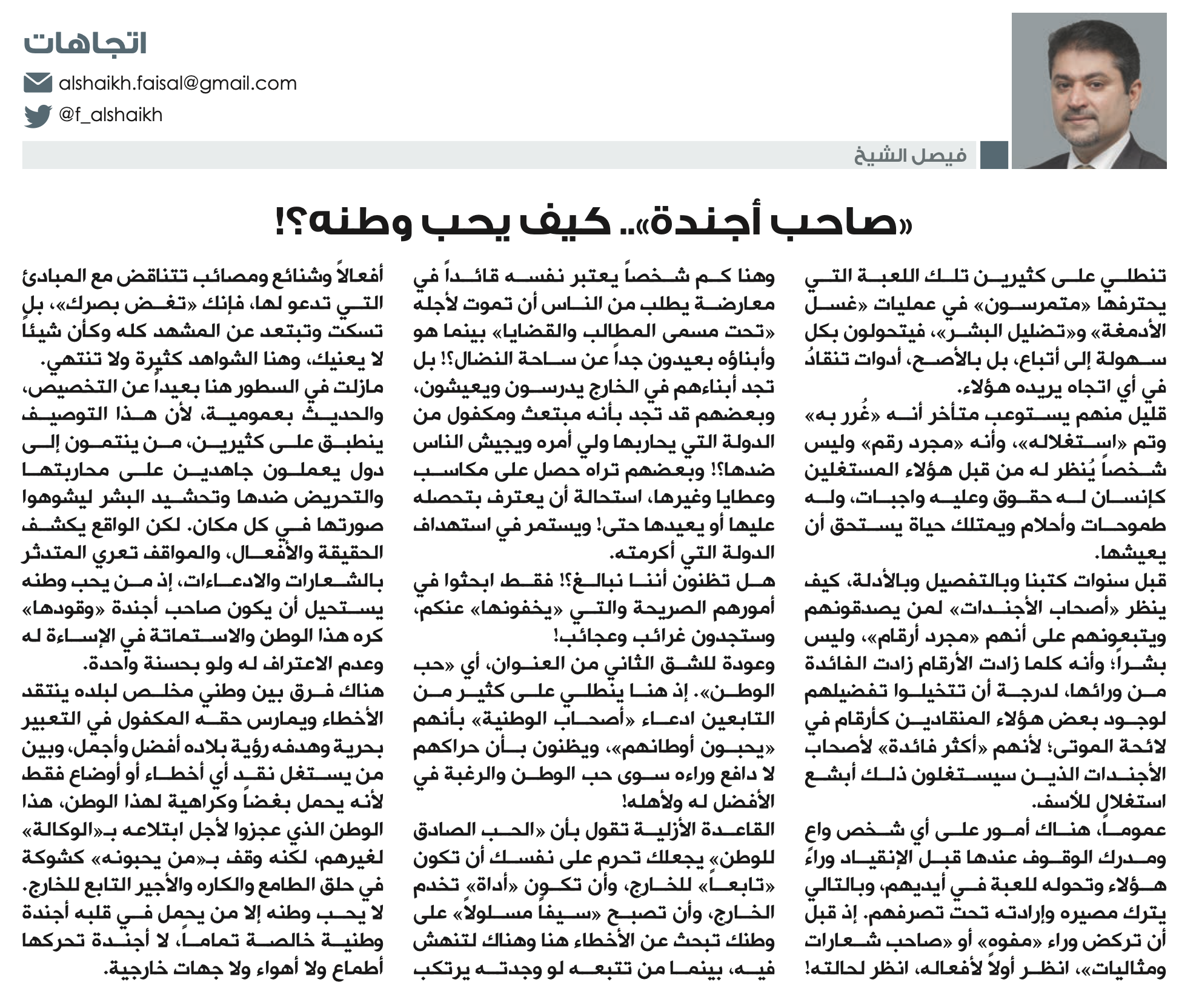 وعودة للشق الثاني من العنوان، أي «حب الوطن». إذ هنا ينطلي على كثير من التابعين ادعاء «أصحاب الوطنية» بأنهم «يحبون أوطانهم»، ويظنون بأن حراكهم لا دافع وراءه سوى حب الوطن والرغبة في الأفضل له ولأهله!