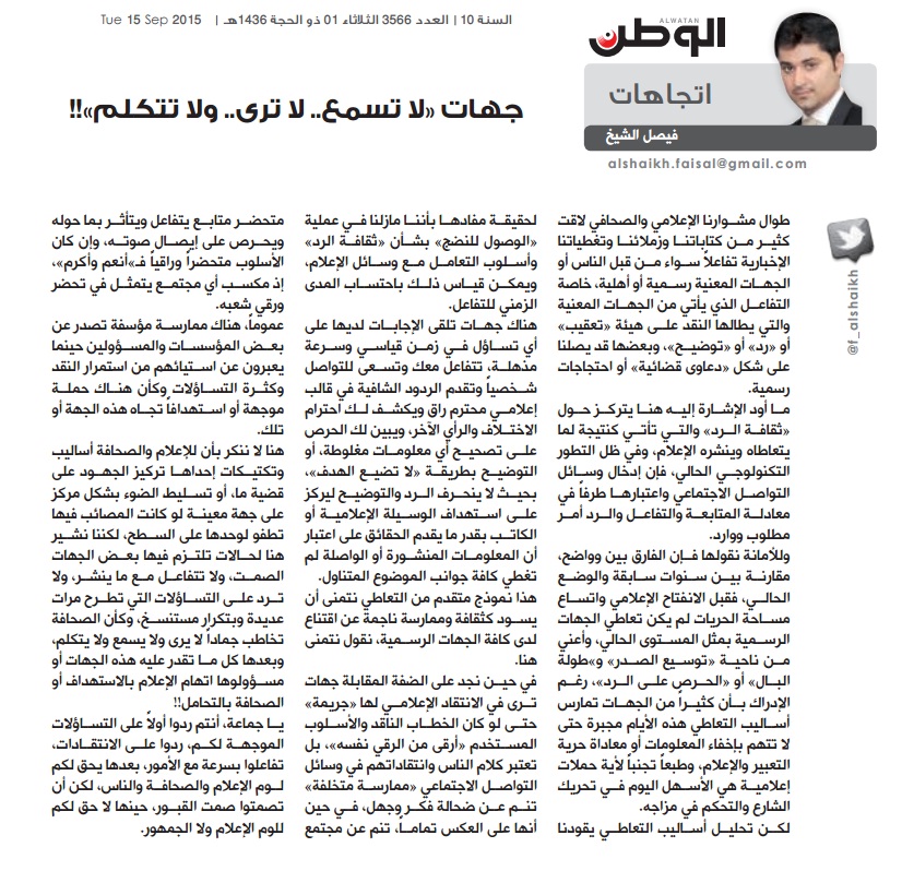 كثيرة هي القرارات والإجراءات المهمة التي تتخذ بمعزل عن الناس ومعرفة آرائهم، وفي أمور تمسهم مباشرة، سواء في وضعهم المعيشي أو الخدمات المقدمة لهم، ومع ذلك فإن معرفة آرائهم وردات فعلهم يفترض أن تكون ذات أولوية، إلا أن بعض المسؤولين واضح أنه يستاء من تعبير الناس عن آرائهم خاصة إن كانت تتضمن نقداً للسياسات أو الإجراءات، وهذا تعامل خاطئ تماماً.