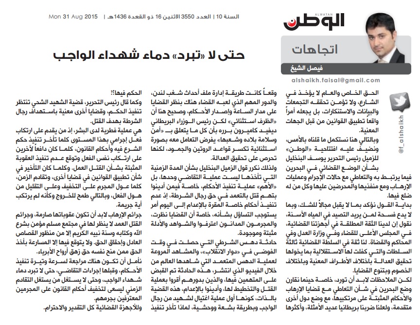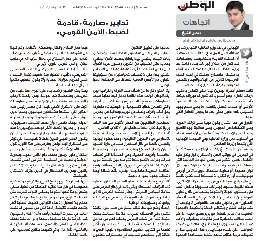 وبالتالي هنا نستكمل ما قلناه بالأمس، ونضيف عليه افتتاحية «الوطن» للزميل رئيس التحرير يوسف البنخليل بشأن الوضع القضائي في البحرين فيما يرتبط به والتعاطي مع حالات الإجرام وعمليات الإرهاب ومع منفذيها والمحرضين عليها وكل من له ضلع فيها.
