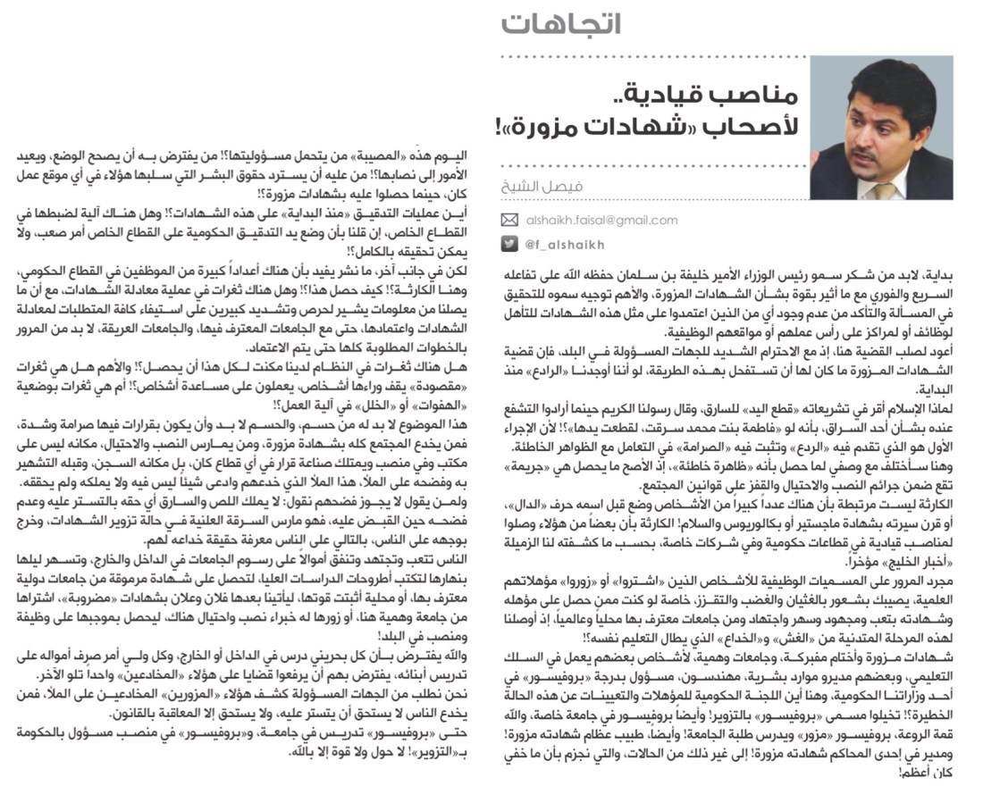 لربما يكون الحل هنا بأن يصدر تشريع معني بـ«إلزام» كل موظف في القطاع العام والخاص، أو أجنبي مسجل على نظام العمالة في هيئة تنظيم سوق العمل، يلزم بتقديم «كشف شهادات أكاديمية» كما هو الحال مع «كشف الذمة المالية» الذي يقدمه مسؤولو الدولة من درجات المدير وما أعلى وصولاً للوزراء.