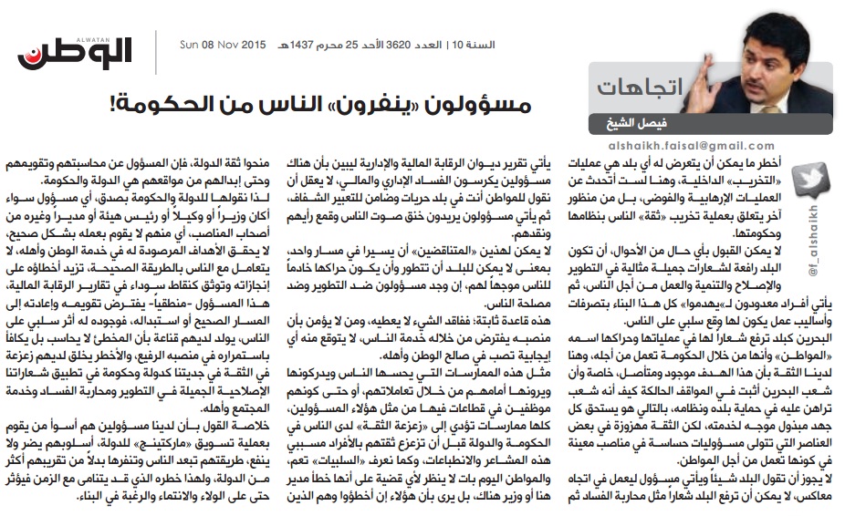 وهنا برجاء ألا يخرج علينا أحد ليتهم الصحافة بأنها «تهول» وأنها سبب في «إقلاق الناس»، إذ العكس هو الصحيح، نحن نكتب نبض النواب وهواجسهم التي يتعامل بعض المسؤولين معهم وكأنهم لا يعرفون عنها شيئاً.